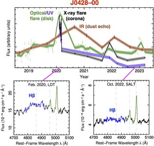In addition, the team used ground-based optical spectroscopic facilities including the W. M. Keck telescope, the South African Large Telescope, and the South African Astronomical Observatory 1.8-meter telescope to track the optical spectra emission lines emanating from the so-called Broad Line Region of gas above the disk, several light-weeks from the black hole. These emission lines responded to the flaring in the ultraviolet band, with J0428-00 showing major evolution in its H-beta line, and J0408-38's He II line responding similarly.